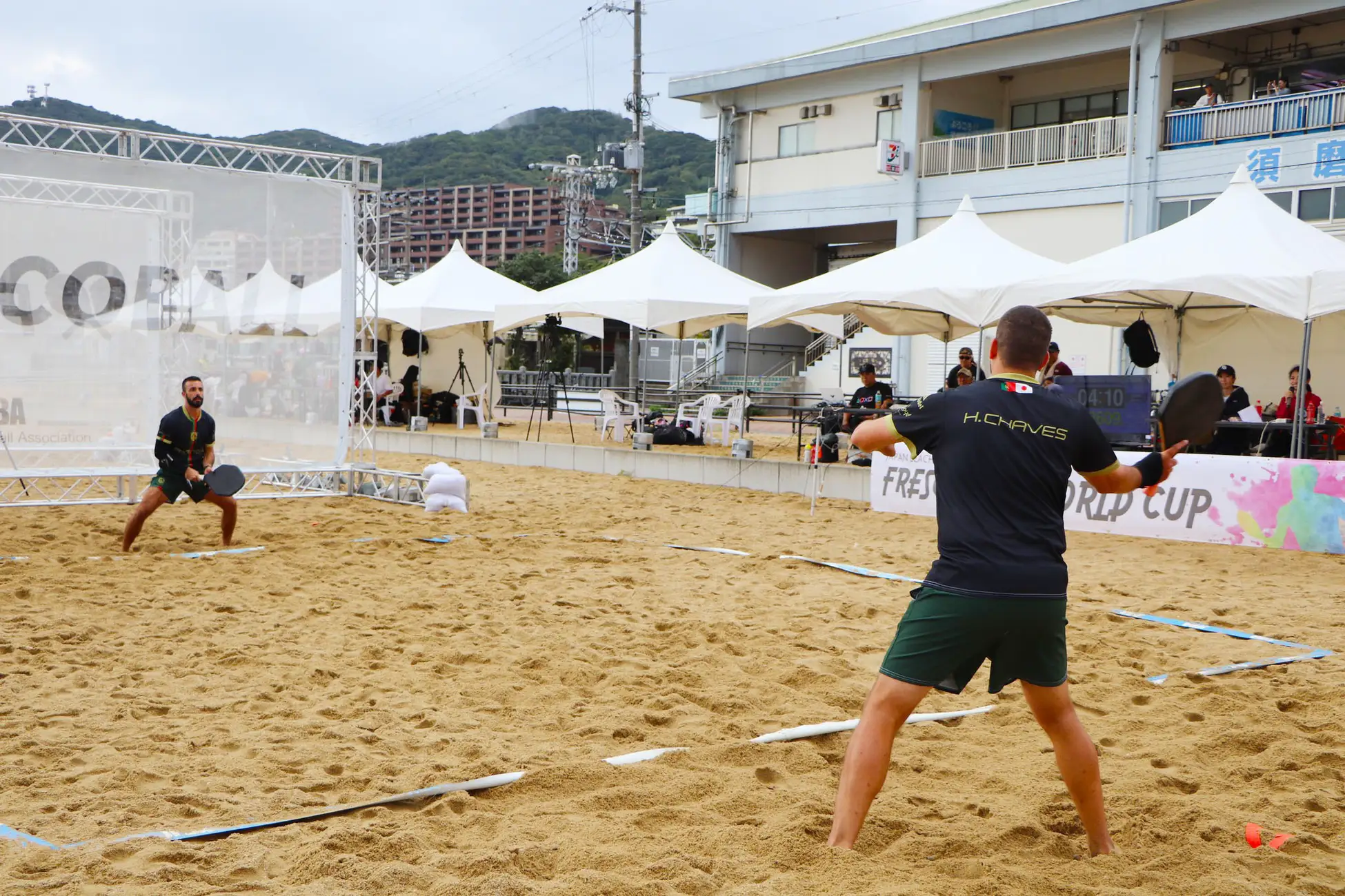 フレスコボールは、ブラジルのリオデジャネイロ発祥のビーチスポーツです。1945年にリオ・デ・ジャネイロのコパカバーナビーチで考案され、現在は世界各地のビーチで親しまれるようになっています。フレスコボールの最大の特徴は、向かい合う2人が競い合うのではなく、協力してラリーを続ける採点競技という点。競技時間は5分間、7mの距離を保って試合を行います。協力してラリーを続ける様子から「思いやりのスポーツ」とも言われています。