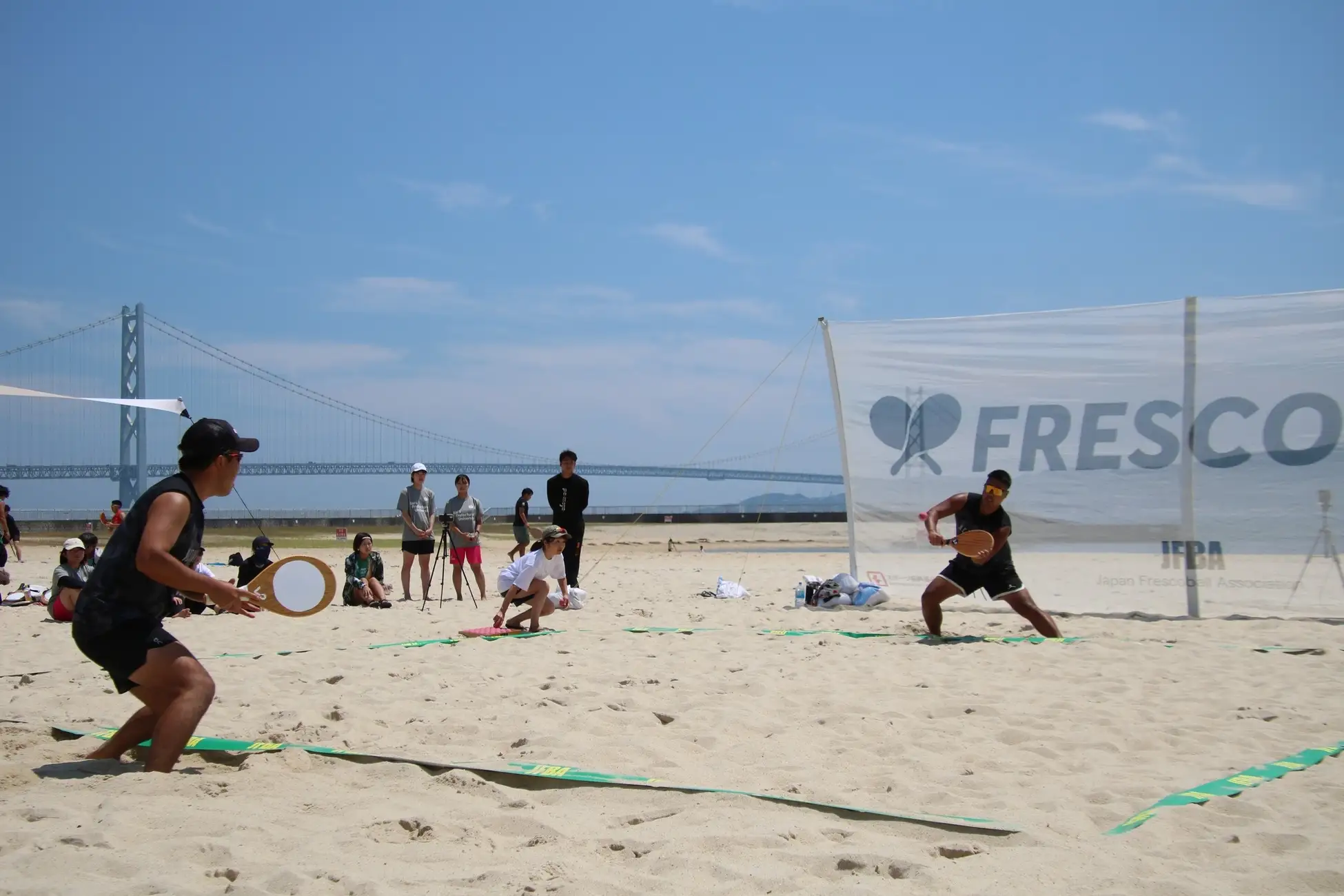 フレスコボールは、ブラジルのリオデジャネイロ発祥のビーチスポーツです。1945年にリオ・デ・ジャネイロのコパカバーナビーチで考案され、現在は世界各地のビーチで親しまれるようになっています。フレスコボールの最大の特徴は、向かい合う2人が競い合うのではなく、協力してラリーを続ける採点競技という点。競技時間は5分間、7mの距離を保って試合を行います。協力してラリーを続ける様子から「思いやりのスポーツ」とも言われています。