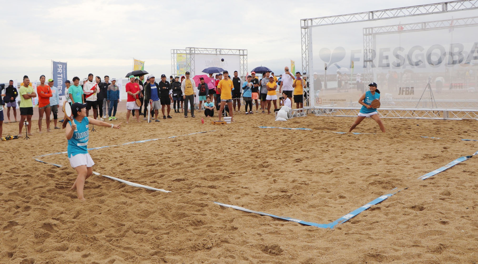 フレスコボールは、ブラジルのリオデジャネイロ発祥のビーチスポーツです。1945年にリオデジャネイロのコパカバーナビーチで考案され、現在は世界各地のビーチで親しまれるようになっています。フレスコボールの最大の特徴は、向かい合う2人が競い合うのではなく、協力してラリーを続ける採点競技という点。競技時間は5分間、7mの距離を保って試合を行います。協力してラリーを続ける様子から「思いやりのスポーツ」とも言われています。